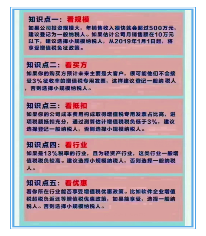如果公司投资规模大,年销售收入很快就会超过500万元,建议登记为一般纳税人。如果估计公司月销售额在10万元以下,建议选择小规模纳税人,从2019年1月1日起,将享受增值税免征政策。